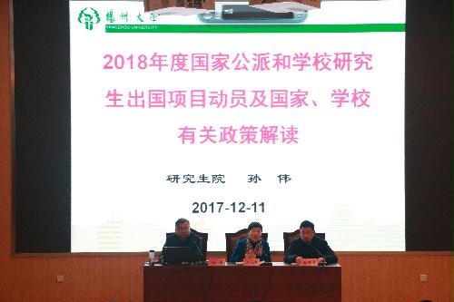 在动员会上,姚晓群副处长详细介绍了国际合作与交流处(港澳台办公室)与我校相关的各类长、短期出国(境)交流项目、联合培养、双学位项目等项目申请条件、申请程序、评选方式、申报注意事项等内容。孙伟副院长详细解读了国家留学基金委相关政策,重点介绍了与我校相关的“国家建设高水平大学公派研究生项目”、“国家公派硕士研究生项目”、“创新型人才国际合作培养项目”、“博士生导师短期出国交流项目”和“扬州大学研究生出国(境)专项基金项目”“扬州大学博士研究生国际学术交流基金”的申请条件、申请程序、评选方式、申报注意事项等内容,并对2018年度我校国家公派研究生项目申报工作进行了部署,对学校发布的《扬州大学关于资助研究生出国(境)交流访学的指导意见》等文件精神进行了宣传,并以自己的亲身经历介绍了赴国外高水平大学学习交流对个人成长带来的益处。高明国副部长做了总结发言,他希望各学院能够重视国家及学校研究生国际化相关政策的宣传,希望广大研究生能够把握机遇,早做相关准备,积极申请,赴一流的国家,师从一流的导师,带回一流的技术,成为一流的人才,打开国际视野。