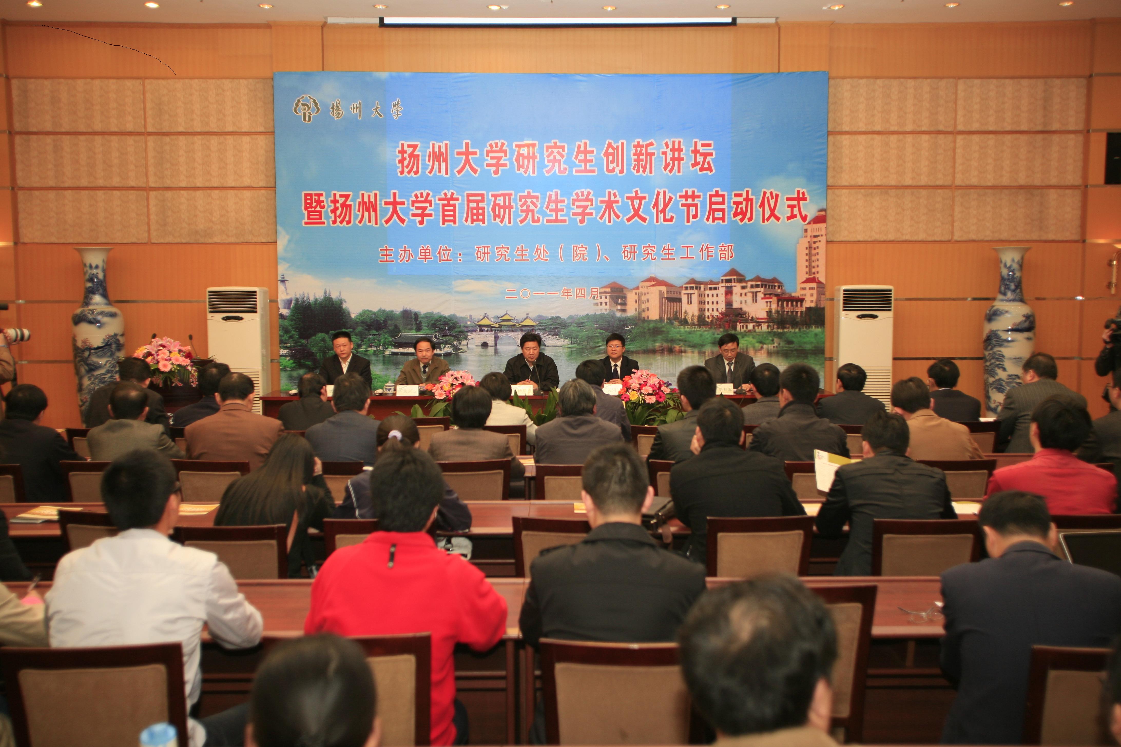 4月18日下午,学校举行“扬州大学研究生创新讲坛暨扬州大学首届研究生学术文化节”启动仪式。校党委副书记、副校长芮鸿岩出席仪式,副校长焦新安和省教育厅研究生教育处处长杨晓江出席仪式并致辞,全国优博指导教师姚文放教授、省企业研究生工作站负责人周骥平教授和研究生科研创新计划项目主持人徐建军博士分别作了汇报发言。