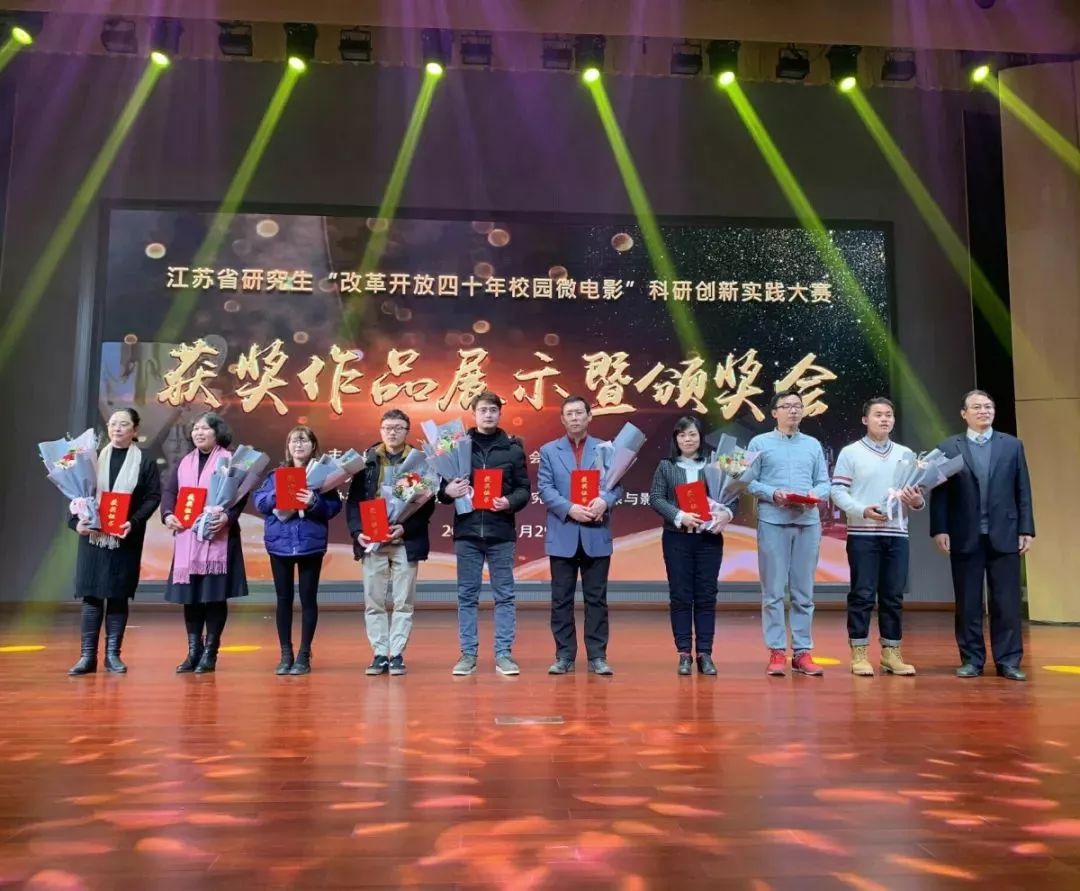12月29日晚,江苏省研究生“改革开放四十年校园微电影”科研创新实践大赛获奖作品展示暨颁奖会在江苏师范大学泉山校区马可音乐厅隆重举行。我校研究生院吉丹如副院长和新闻与传媒学院武新宏副院长带领部分获奖团队参与此次颁奖典礼。