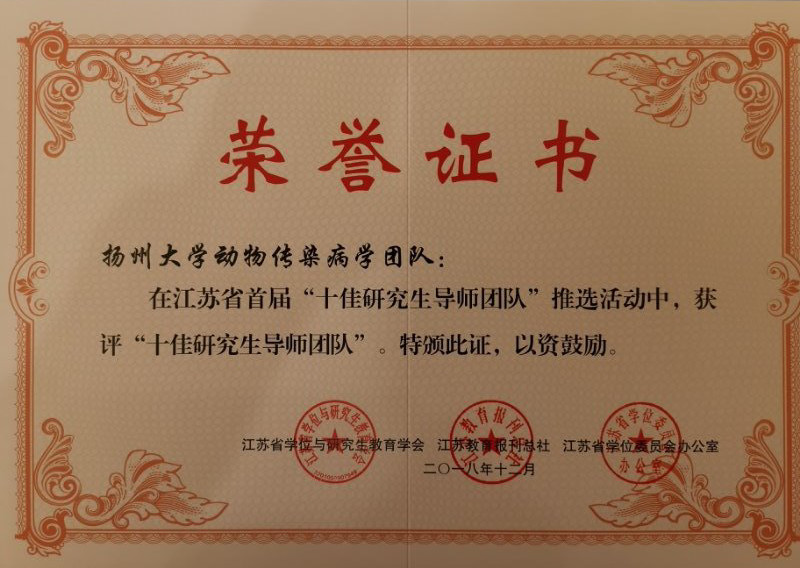 扬州大学动物传染病学团队成员:刘秀梵、焦新安、高崧、彭大新、吴艳涛、潘志明、刘文博、陈素娟、刘晓文、胡顺林、张小荣、王晓泉、顾敏、高清清、胡娇、秦涛、刘慧谋、甘军纪。他们对学生的学习和研究要求非常严格,从每一个重要实验的设计,到实验过程中出现问题的分析、可能存在的原因及对策都给予精心的指导,还经常就文献中的内容和试验思路与研究生们讨论和共享。他们深入开展研究生教育教学改革,成绩斐然,主持完成的《现代兽医一流人才“三四三”培养体系构建与实践》获2016年度江苏省教学成果特等奖。团队成员焦新安教授获2014年度国家级教学成果二等奖、2016年度中国学位与研究生教育学会二等奖。