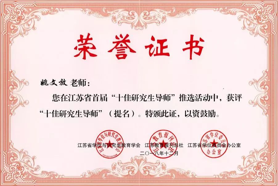 多年来,姚文放言传身教,循循善诱,引导一届届学子在求学之路上不忘初心。他创设了“三三制”研究生培养模式,严把“三道关”,把好研究生学位论文的“前答辩”、“答辩”和“后答辩”三个关口,将提高研究生教育质量作为一个综合性的系统工程来抓;锤炼“三文本”,在指导研究生学位论文时严把盲审本、答辩本、档案本,构成打造一篇优质论文的三个环节;搭建“三平台”,让研究生参与高层次项目的研究,在导师指导下,在立项、结项、评奖等三个高层次的平台上经受学术磨砺,为研究生以较强的科研能力完成学业打下了坚实的基础。