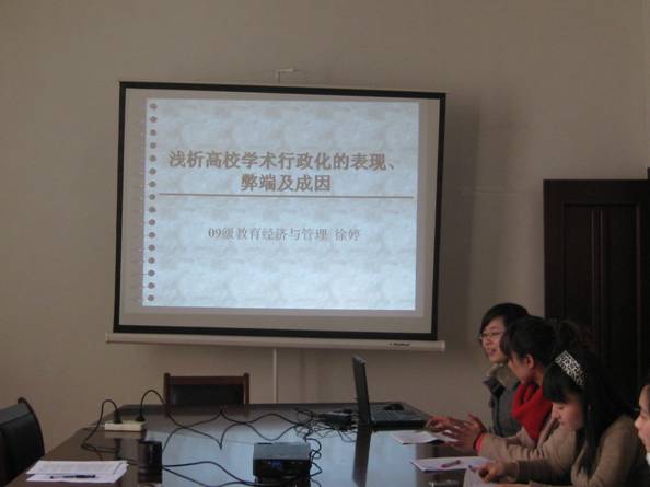 本次论坛有两位主讲人,一位教育经济管理的徐婷同学,她主讲的题目是《浅析高校学术行政化的表现、弊端及成因》。文章的第一部分是高校学术行政化的表现,第二部分为高校学术行政化的弊端,第三部分是高校学术行政化的成因,第四部分为高校学术行政化改革的设想。老师们认为文章选题是老生常谈的问题,并且对这篇文章提出两方面的建议:一方面,从研究形式、方法、思路上提出一些建议,另一方面在研究内容的设计、方法、总结、表现上也给出了意见。并且作为报告人,应该考虑在至少某个方面或几个方面有创新,文章也要考虑有做一些调研、访谈、问卷。