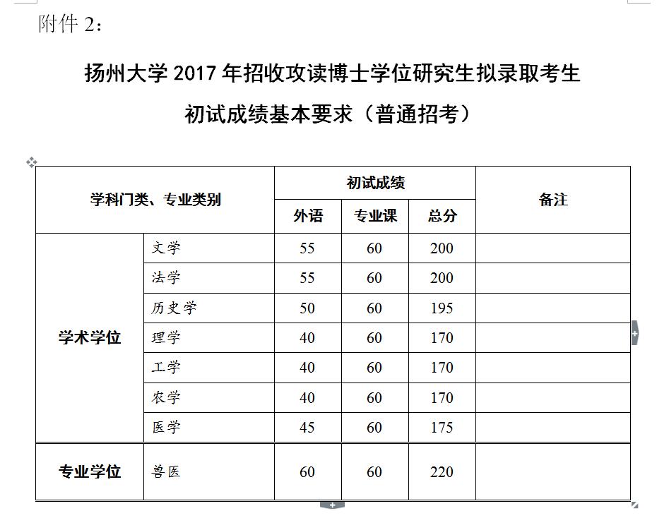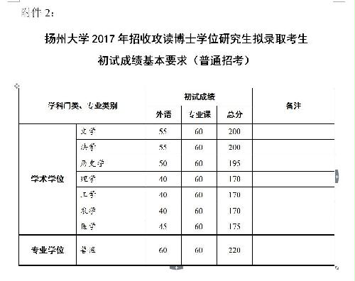 根据《教育部办公厅关于做好2017年招收攻读博士学位研究生工作的通知》(教学厅〔2017〕2号)、《扬州大学博士研究生招生管理办法(试行)》(扬大研院〔2015〕20号)及江苏省2017年研究生招生录取工作会议精神,结合我校实际情况,现就我校2017年博士研究生招生录取工作提出如下意见: