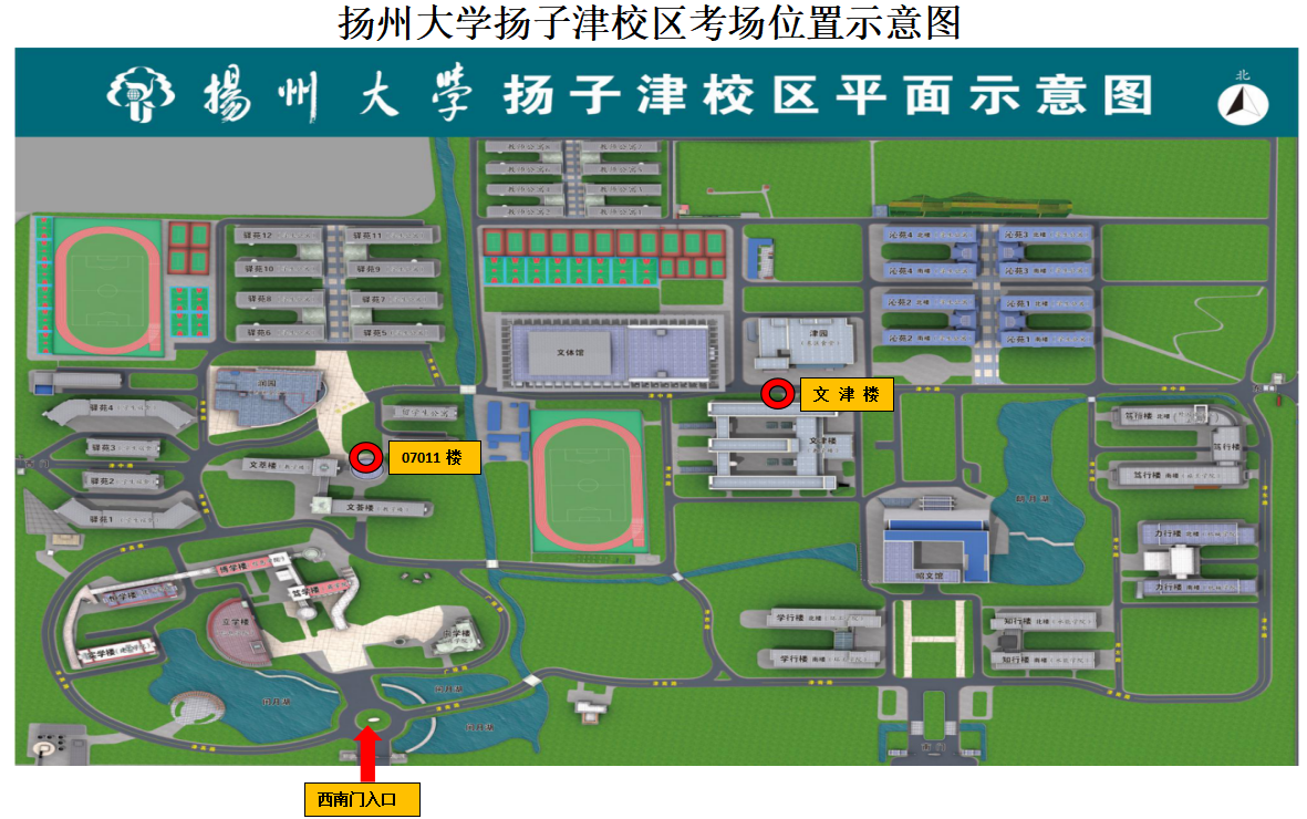 考试分设三个考区:扬州大学瘦西湖考区(8号楼)、扬州大学扬子津考区(文津楼、07011号楼)、扬州工业职业技术学院考区(自清楼)。
